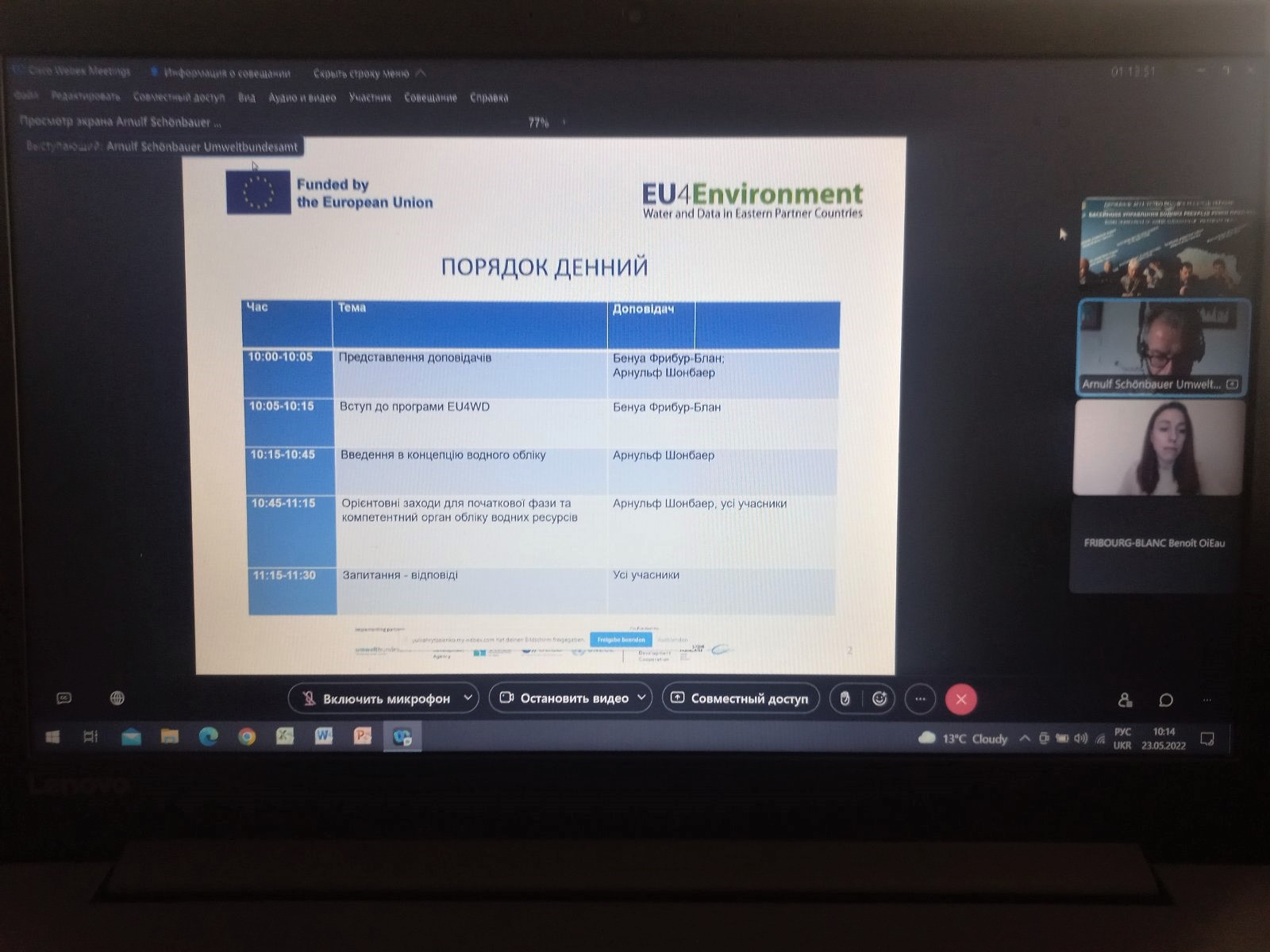Під час зустрічі представники Фінського інституту навколишнього середовища, Міністерства навколишнього середовища Фінляндії акцентували увагу на питаннях моніторингу поверхневих вод, його важливість та значення для суспільства. Обговорили значення водозбірного басейну, гідрології та морфометрії для якості води; класифікації та виборі водних об'єктів, що підлягають моніторингу, на основі Водної рамкової директиви. Поділились досвідом Фінляндії з моніторингу пріоритетних речовин згідно з ВРД, вимогами ЄС до моніторингу вод, механізмами впровадження планів управління річковими басейнами.