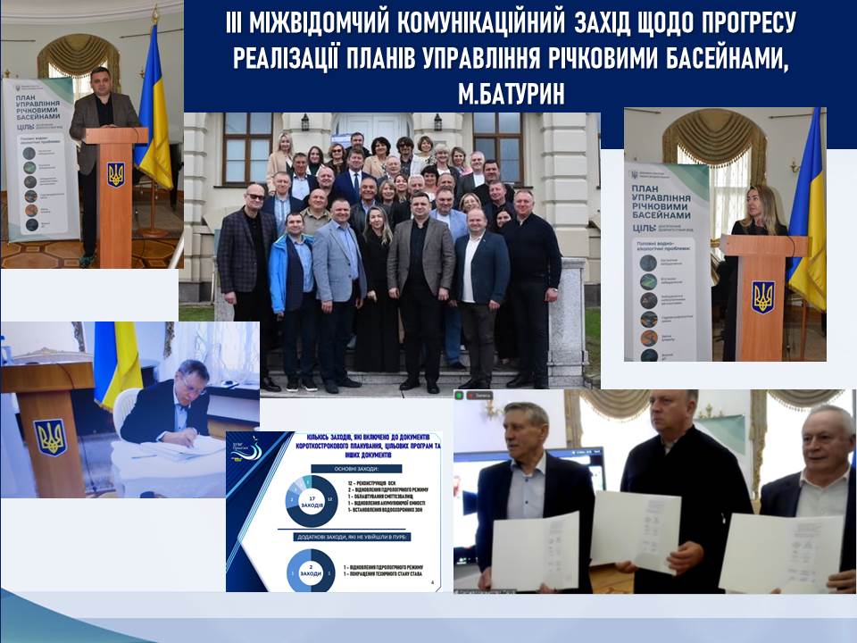 У місті Батурин, що на Чернігівщині відбувся ІІІ Міжвідомчий комунікаційний захід щодо прогресу реалізації планів управління річковими басейнами (ПУРБ). Участь у заходах взяв начальник Басейнового управління водних ресурсів річки Прип’ять Василь Азима. Разом із представниками центральних і місцевих органів влади, міжнародних організацій, експертів та громадськістю було обговорено прогрес впровадження ПУРБ.