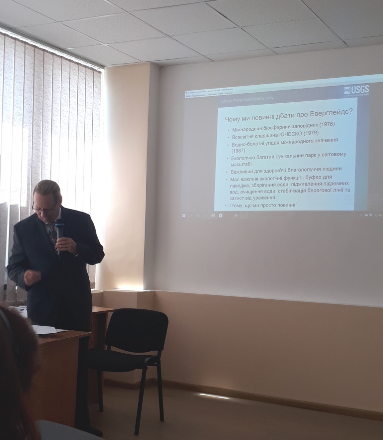 Регіональний науковий радник і координатор Програми пріоритетних екосистем Еверглейдс, представник Геологічної служби США Ніколас Аумен, представник Офісу Міністерства внутрішніх справ у Іллінойсі Роман Фердінанд поділились ключовими умовами ефективної участі стейкхолдерів на ранніх стадіях процесу при прийнятті рішень на особистому досвіді на прикладі «Відновлення Еверглейдс» - водно-болотних угідь міжнародного значення, біосферного заповідника, що у Південній Флориді США.