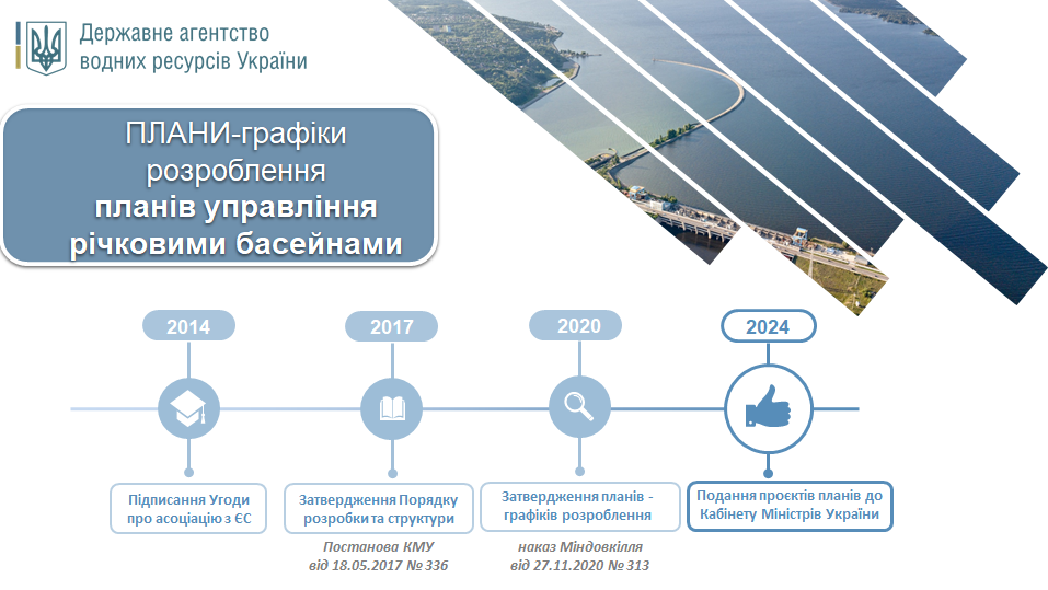 1 листопада 2024 року Кабінет Міністрів України затвердив перший шестирічний План управління річковим басейном Дніпра на 2025-2030 роки, підготовлений у відповідності до підходів Директиви № 2000/60/ЄС про встановлення рамок діяльності Співтовариства у сфері водної політики та за підтримки європейських партнерів - програми EU4Environment: Water and Data.