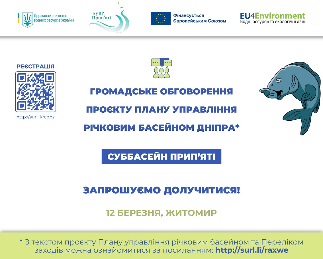 12 березня 2024 року у місті Житомирі відбувся захід з публічного громадського обговорення проєкту Плану управління річковим басейном Дніпра, до якого належить суббасейн річки Прип’ять.